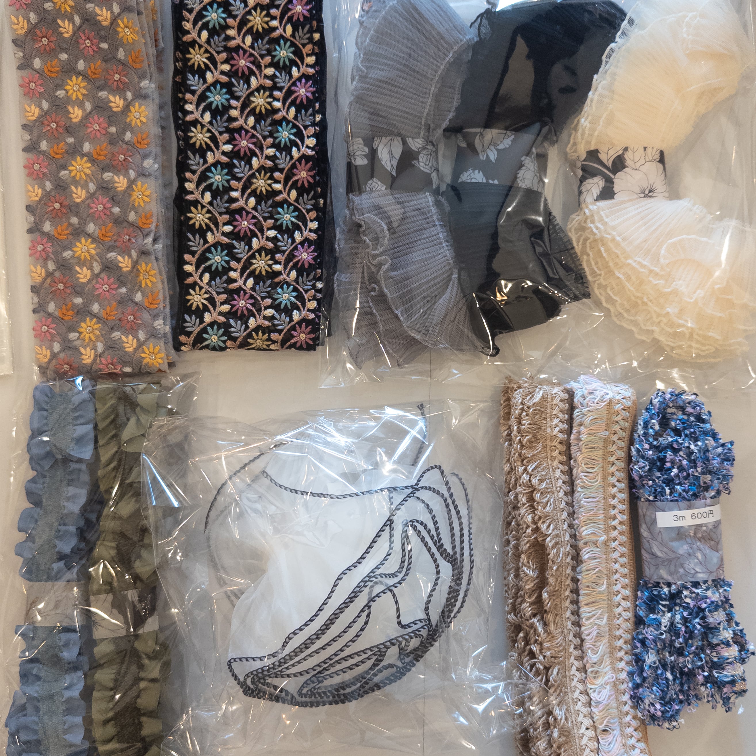 【1788】チェコガラスボタン1点、インド刺繍リボン39点、フリル9点